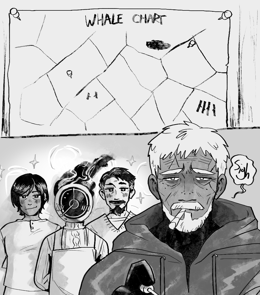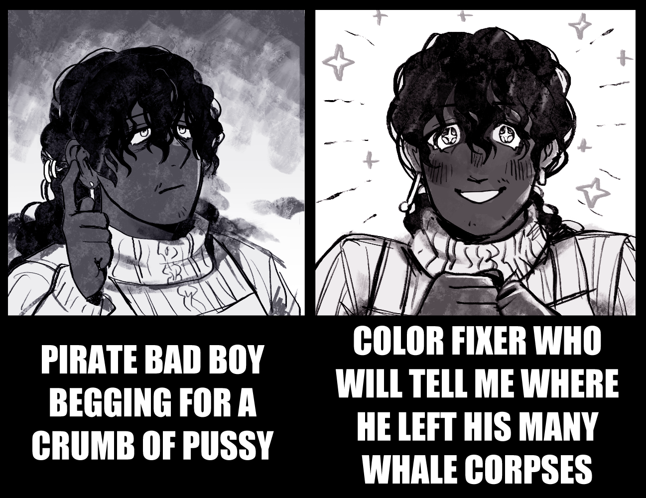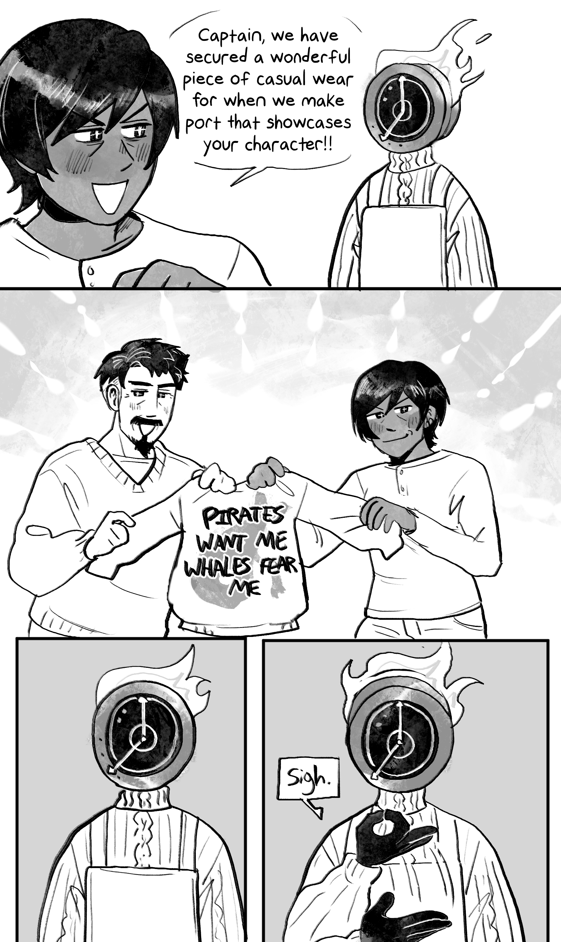 After manifesting an EGO in the fallout of a disastrous voyage, Dante has become a whaling ship captain who exclusively hires the paypigs the Hook Pirates exploit with their first mate Adino (OC) and Master-at-arms Outis. They grapple with trying to remain kind when dealing with the worst sides of society, and also waffle on the obvious crush Hook Pirate First Mate Gregor has on them.